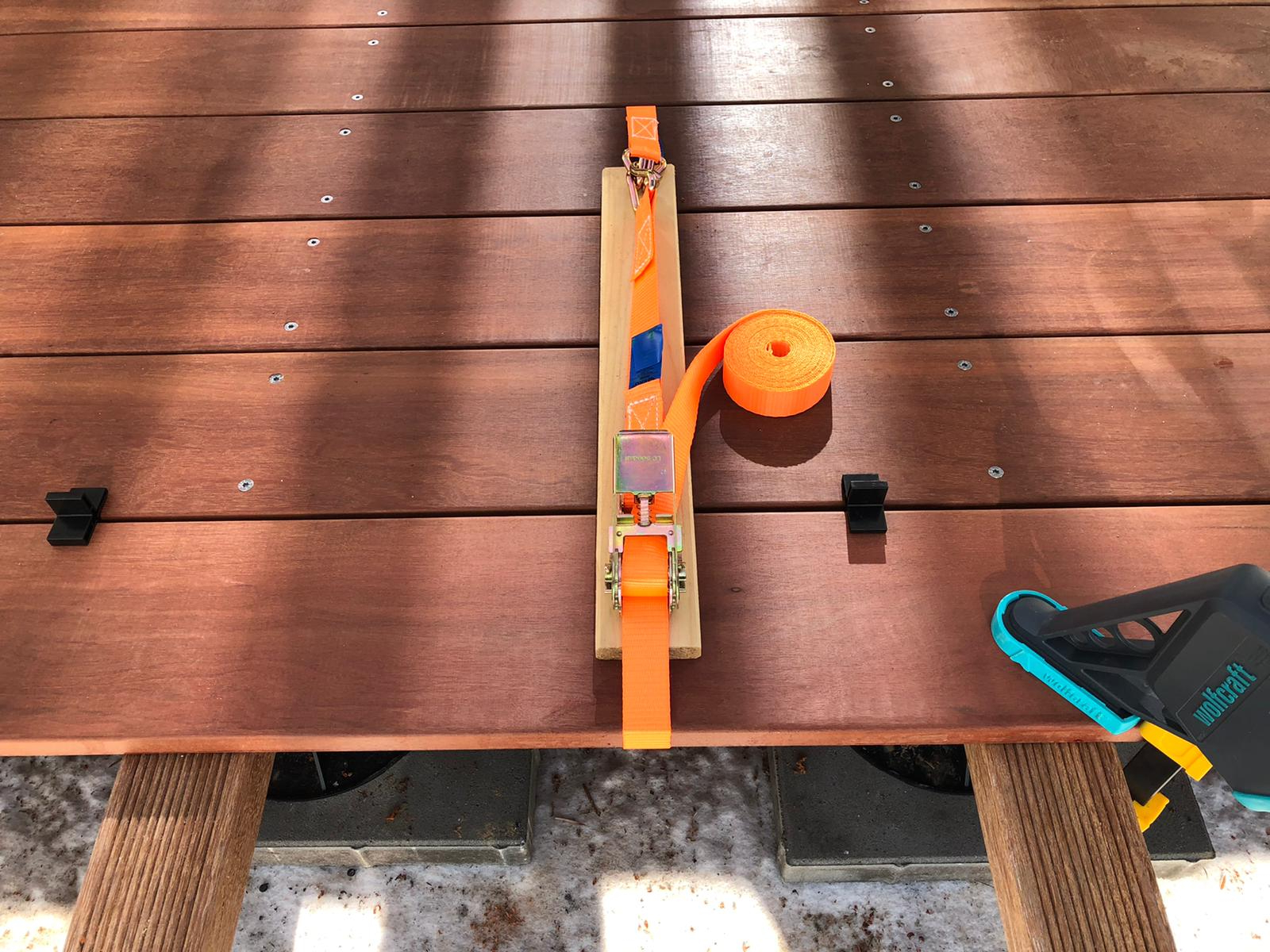 Při instalaci terasy nám pomáhají montážní svorky, vymezovací křížky, pryžové podložky, stahovací popruhy, bity, speciální zahlubovací vrtáky apd.